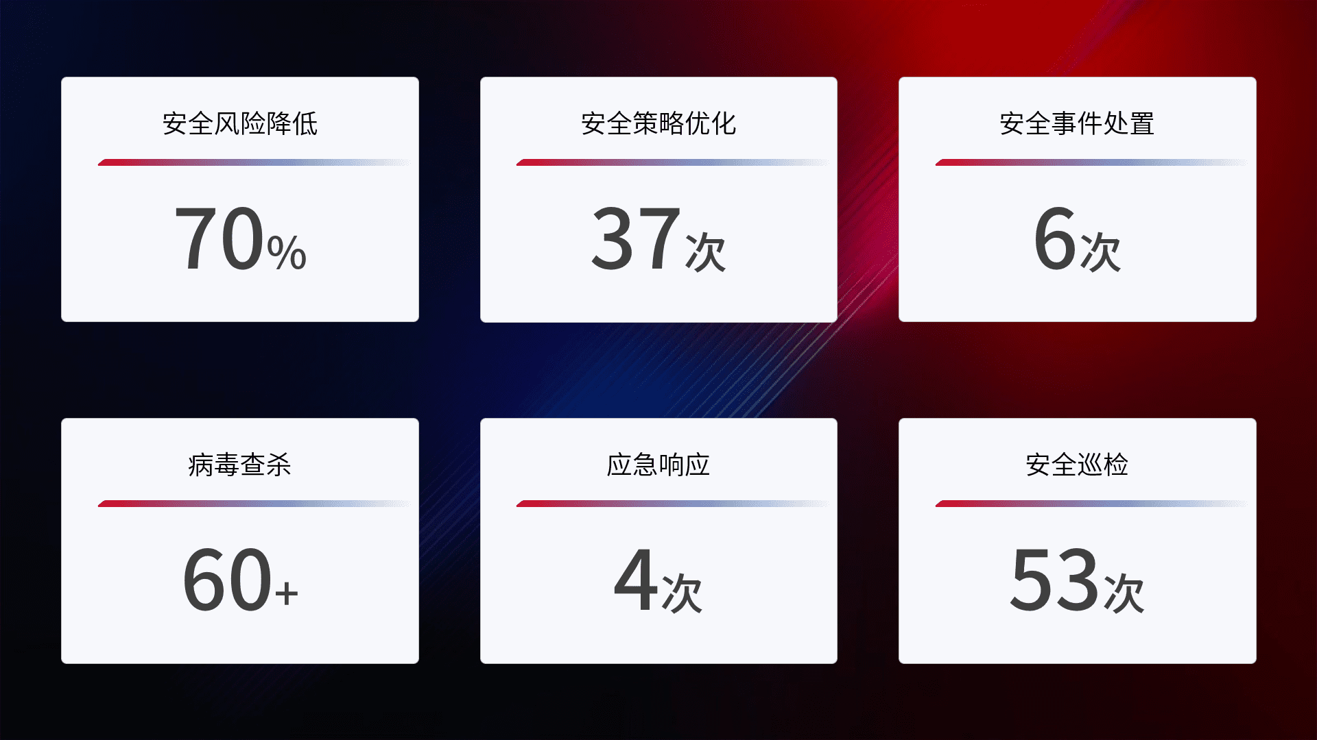 提供全面的安全事件报告体系,,包括处置报告、、周报、、、季度和年度总结,,,,结合持续监控,,,,帮助客户深入了解网络安全状况。。
