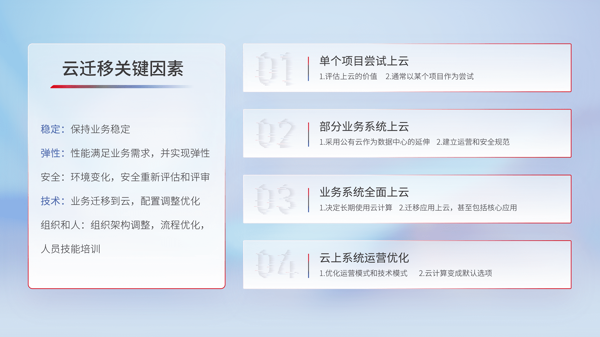 结合实际业务,,,从规划设计、、、云平台选型、、、、云原生改造、、数据迁移、、、、集成交付,,,,迁移全过程为客户识别最佳上云路径,,做好风险识别管理,,,,设计网络架构、、、、身份权限、、、、安全审计合规、、、操作审计、、、、日志审计、、、监控告警策略、、、、多站点容灾设计等,,,对云上基础设施进行整体规划,,提升IT治理水平,,,以满足弹性、、、高可用、、、高性能的需求。。。。
